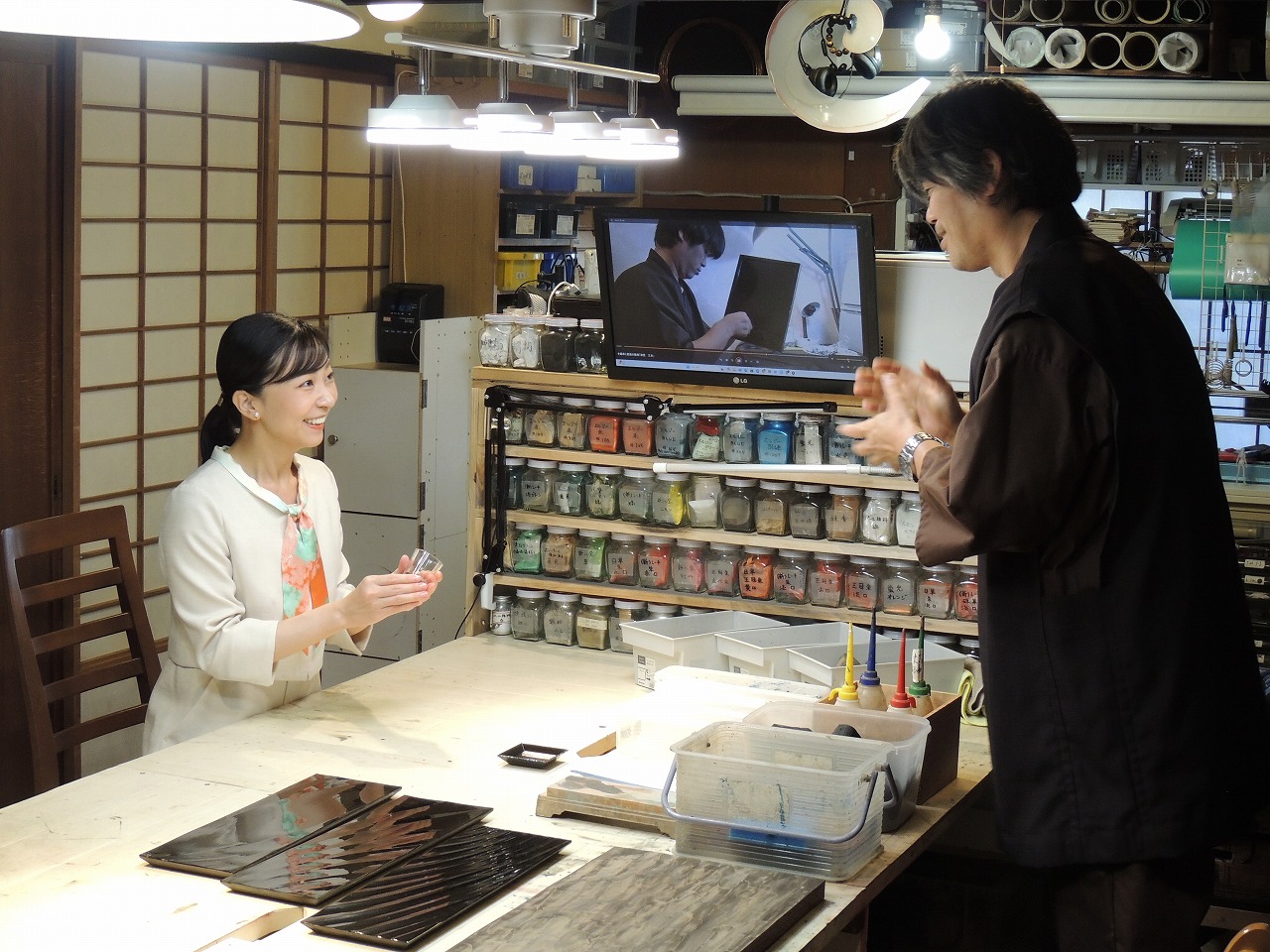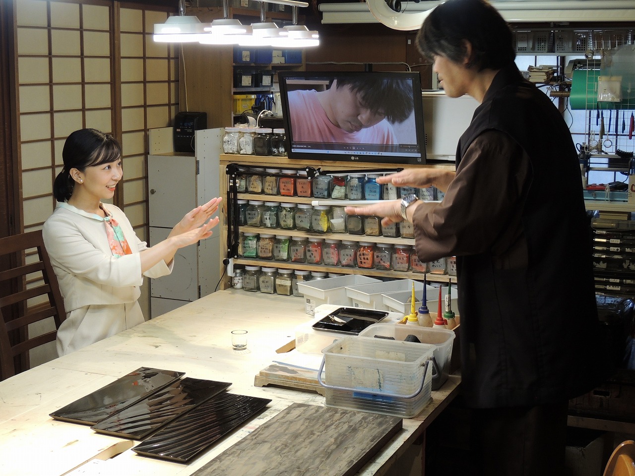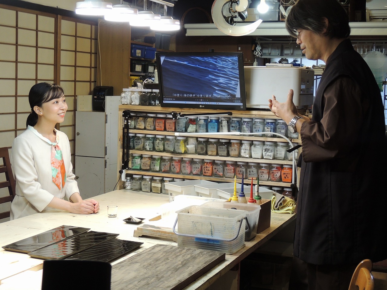 漆工芸三木表悦の工房にて、漆の工程や作品の作り方をお尋ねになる総裁